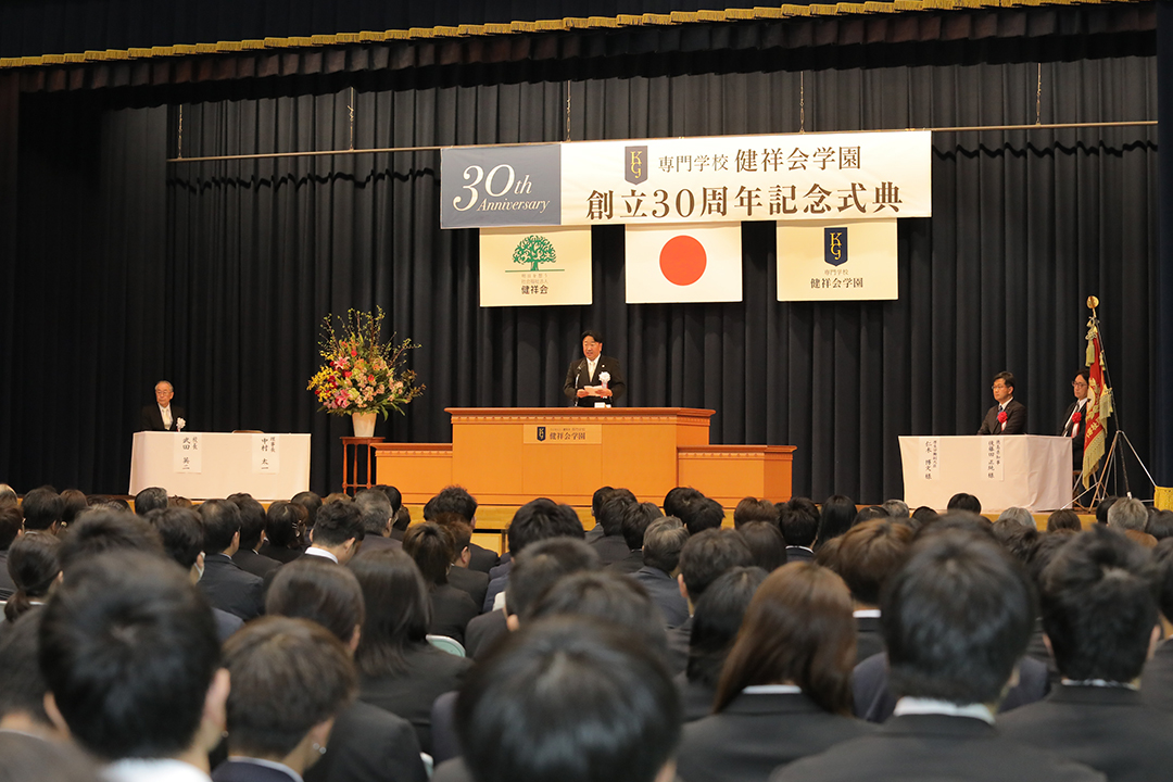 本日ここに、厚生労働副大臣 衆議院議員 仁木博文様、徳島県知事 後藤田正純様をはじめ、多くのご来賓の皆様にご臨席賜り、専門学校健祥会学園創立30周年記念式典を挙行できますことは、この上ない慶びです。心より御礼申し上げます。