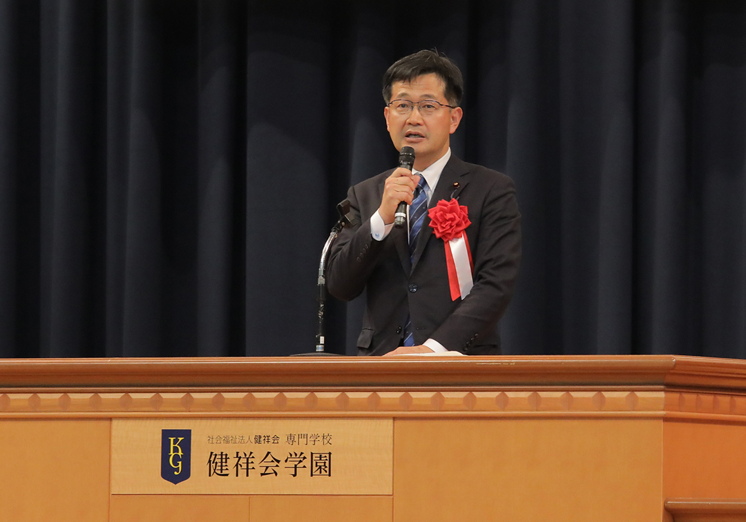 30周年おめでとうございます。「人と人、心と心」という言葉に象徴される学園の理念はとても大切なものだと感じています。医療や介護、保育は人が人を支える尊い仕事であり、その土台となる教育は非常に重要です。私自身も現場にいた経験から、その重みを実感しています。一方で、今の日本は少子高齢化が進み、社会保障の仕組みも大きな課題を抱えています。特に介護現場は労働環境や賃金面で厳しい状況にあります。国としても制度の見直しや処遇改善に取り組んでおるところであり、将来に希望が持てるキャリアの道筋を示すことが重要だと考えます。また、日本語学科の設置により外国人材の育成が進むことは、日本の経験を世界に広げるという意味でも有意義な取り組みであり、皆さんにエールを送りたいと思います。日本の介護が世界に誇れるものとなることを祈念し、祝辞とさせていただきます。本日はおめでとうございました。