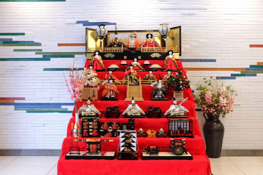 ロビーには赤いひな壇に並んだ華やかなひな人形が飾られ、施設内の雰囲気も一気に春らしくなりました。