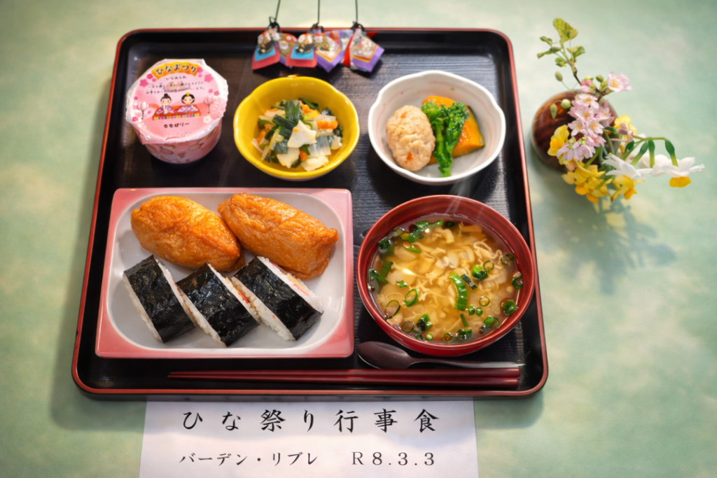 3月3日のひな祭りに合わせて、施設では特別な行事食を提供しました。ひな祭りは、健やかな成長と幸せを願う大切な日本の行事です。今回のお食事も、そのような願いを込めながら、春らしい彩りとやさしい味わいを意識した献立となっています。