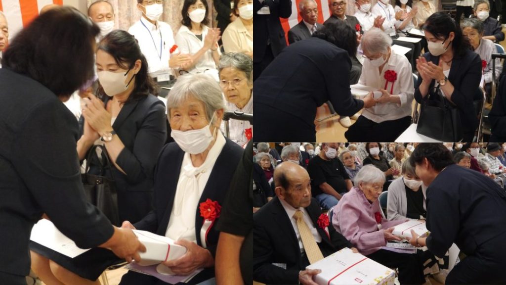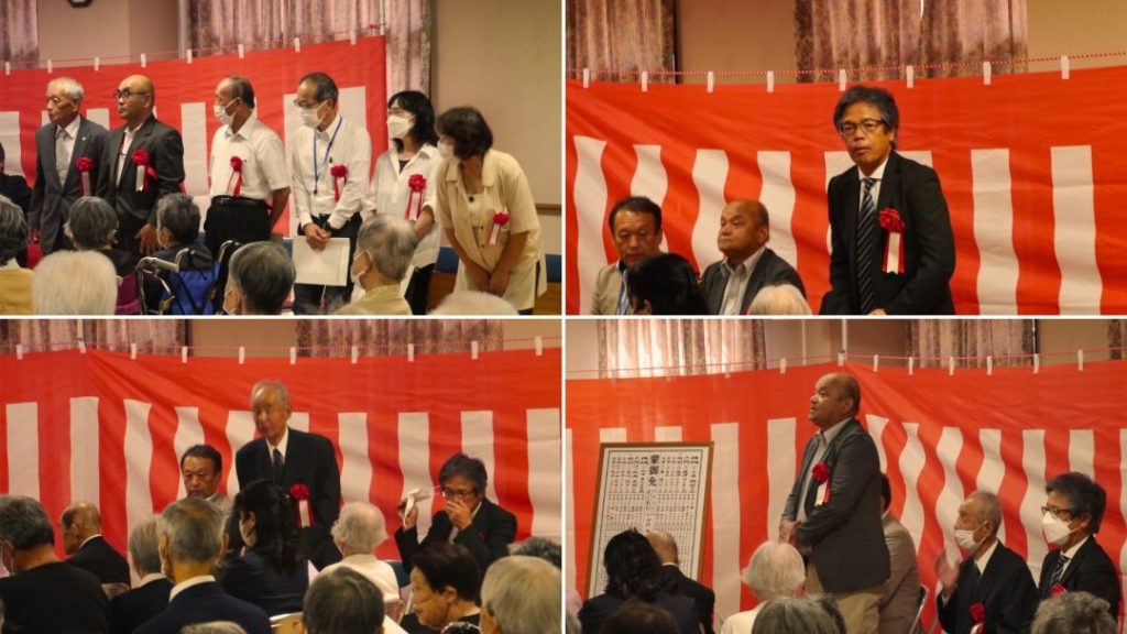 最高齢者東横綱105才・西横綱100才のお2人には北池人事部長から。白寿・米寿・喜寿の方には、赤松施設長から記念品が手渡されました。皆様、おめでとうございます。