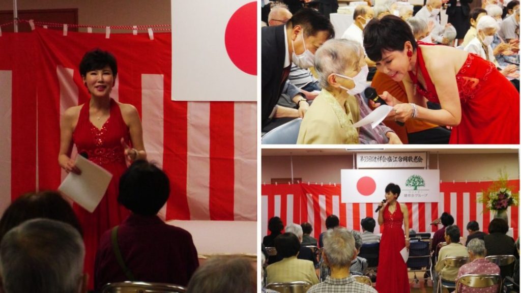 今年は歌が好きな利用者様が多いことから、プロの歌手(香月ゆみ様)を招いて歌を披露していただきました。