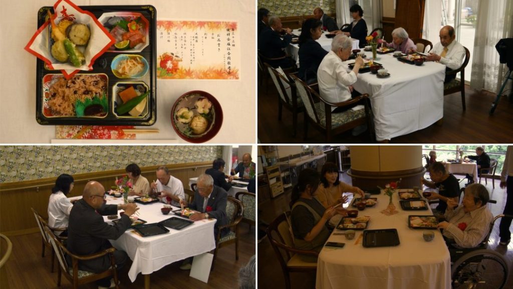 式典・演芸のあとはお楽しみの会食です。今年は人数が多いため、2か所に分かれて食事を行いました。来賓・招待客・デイケアの利用者様はデイルームで、入所者様とご家族は5階の会場で。