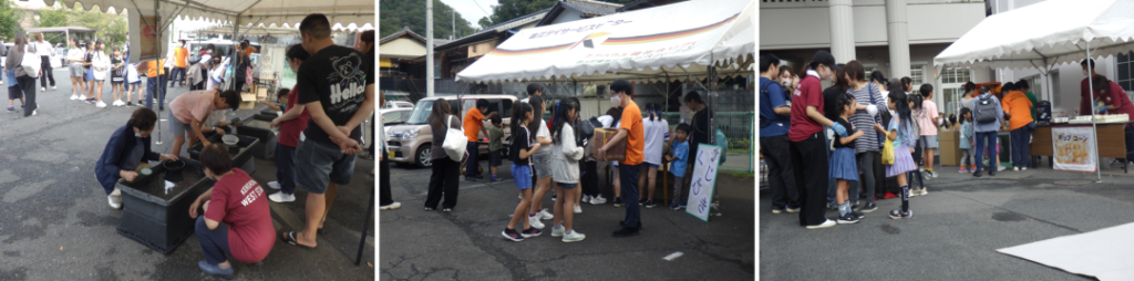 今年は「射的」「くじ引き」「メダカすくい」「綿あめ」「ポップコーン」「たこ焼き」と、バラエティ豊かな模擬店が立ち並びました。