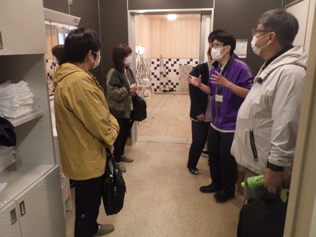 普段なかなか見ることのできない介護施設の内部をスタッフがご案内。居室や共用スペース、リハビリ設備などを実際にご覧いただきながら、介護の現場についてご説明しました。