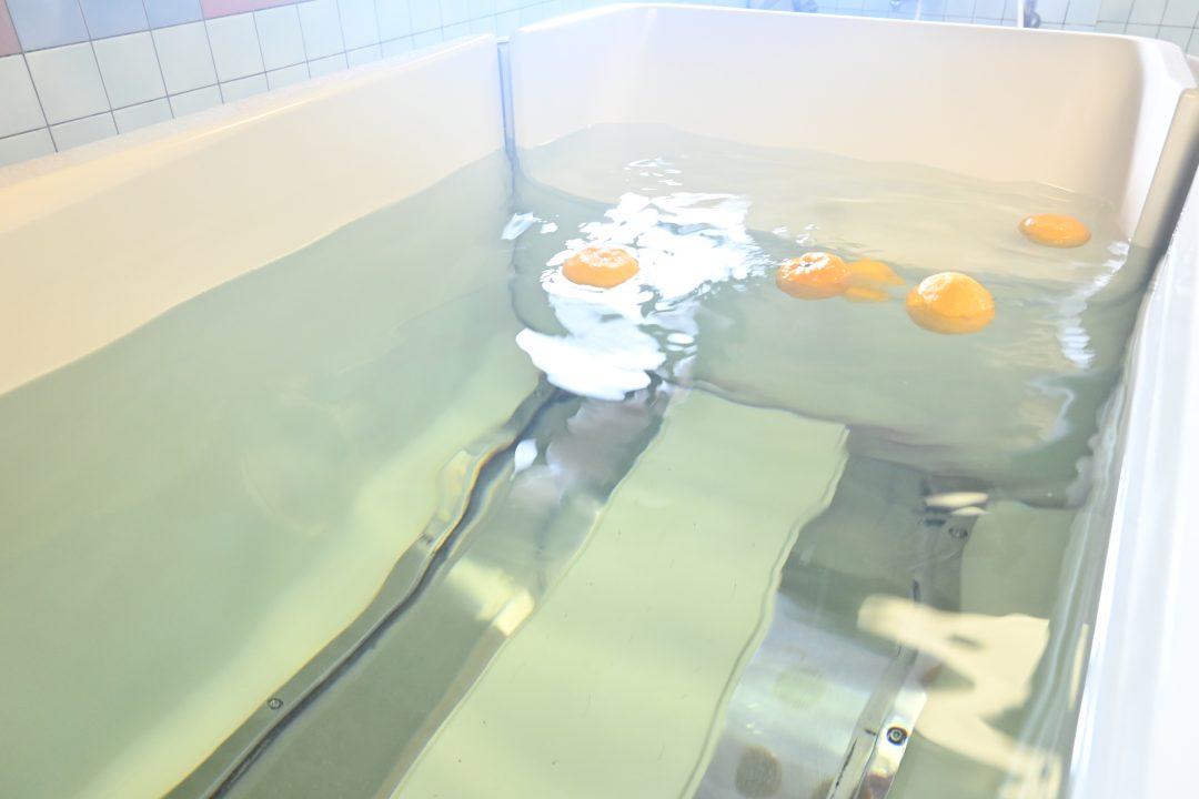 浴室広がるゆずの香りがたまりません。ちなみに、ゆず湯には、①血行促進・冷え性対策、②リラックス・ストレス軽減、③美肌・乾燥対策の効果があるそうです。みなさんも自宅でゆず湯を楽しんでみてはいかがでしょうか?