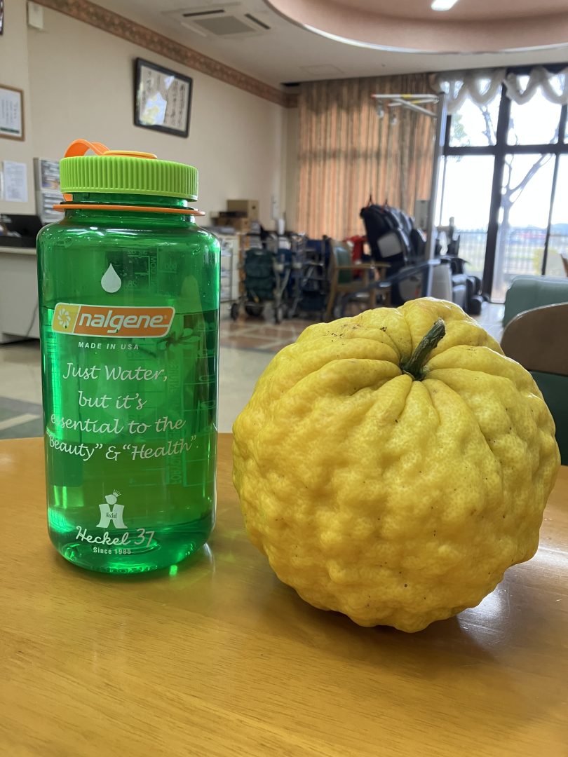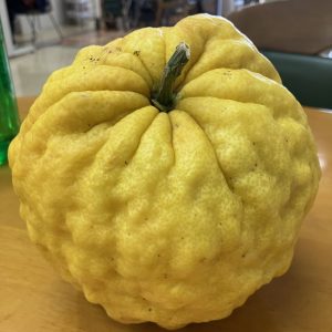 顔の大きさぐらいある大きなゆず。観賞用らしいですが、ずっしりと重く、見ごたえ、持ちごたえも十分です😊