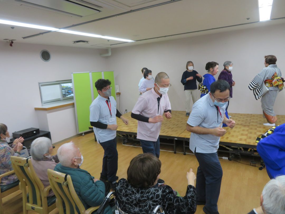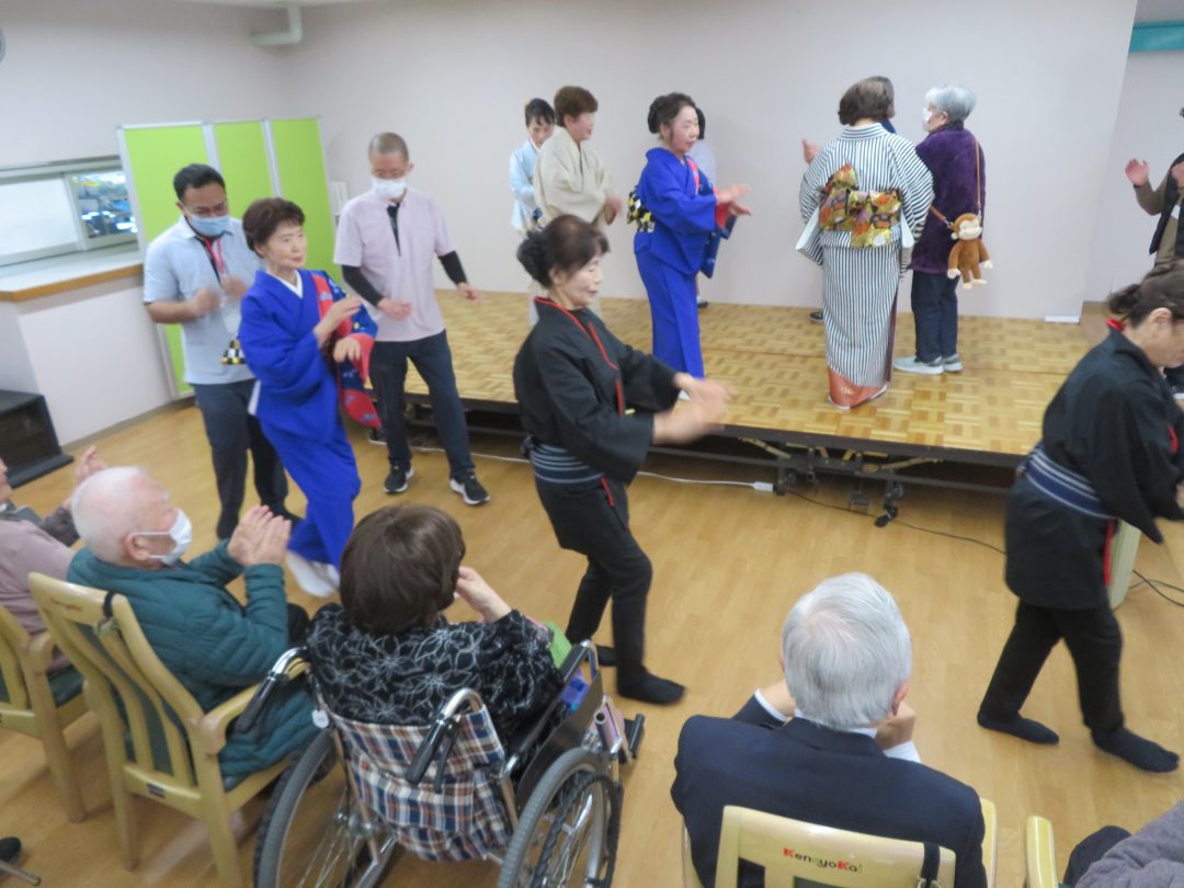 また、阿波踊りや炭坑節に合わせた踊りを入所者様を交えて一緒に踊って