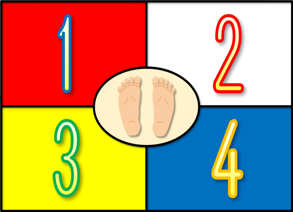 下の写真(マット)をご覧ください。1・2・3・4と書いた4つの四角形がありますね。また、赤・白・黄・青の色も塗ってありますね。真ん中には、足底👣があります。これを使ってリハビリをするのです。やり方は簡単です。前のスクリーンに映った番号や色の通り、足元に置いてあるマットの番号や色を踏んでいく。=足ふみしていく。というリハビリです。しかもレベルが上がれば、歌のリズムに合わせて足ふみをしていくという優れものです!