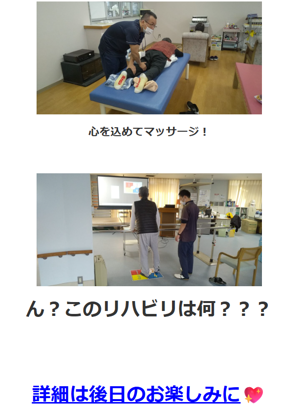 有名な先生かどうかは置いておいて、当施設作業療法士、NUが考案した、オンリーワンリハビリです。通所リハビリ利用者様からも受けが良く、笑顔で取り組んでいただけています。「ゲームみたいで楽しい。」「音楽があるからリズムよく足ふみできる。」などのご感想を多数いただいております。