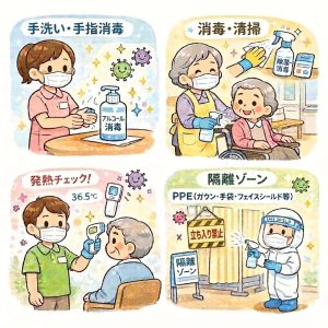 感染症対策委員会は、施設内での感染症の発生を予防し、万が一発生した場合にも拡大を防ぐ ことを目的として活動しています。高齢者は免疫力が低下していることが多く、感染症が重症化しやすいため、日頃からの予防と迅速な対応がとても大切です。