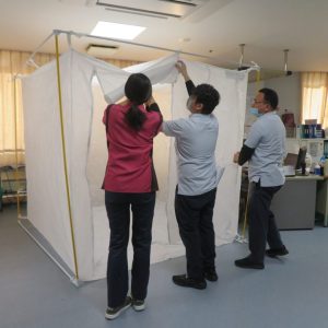 車椅子での横ずれや滑落が防止できるよう姿勢を保持できる座面を体験!! 身体状況に合わせて選択できるよう、厚みや形状などの種類が豊富にありました。