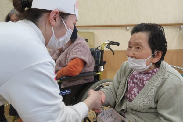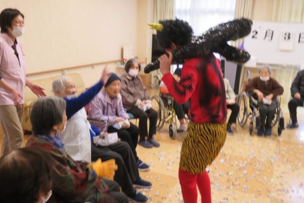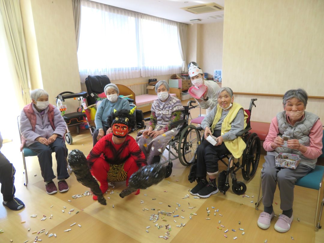 皆さまに投げていただいた豆は、入所者様が手作りされた「紙製の豆」。