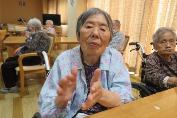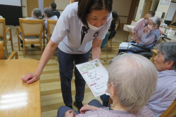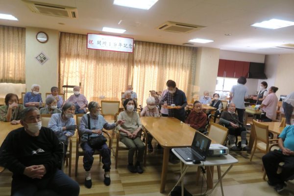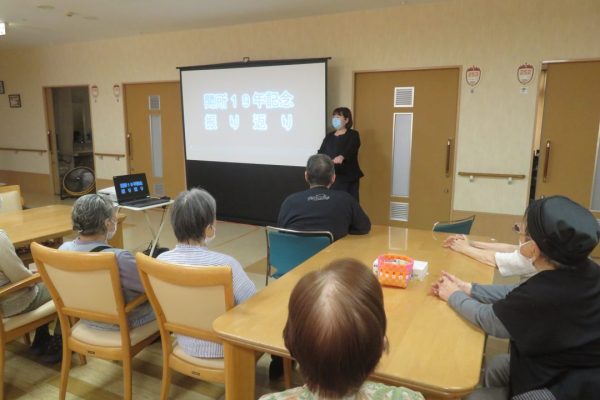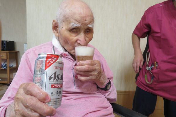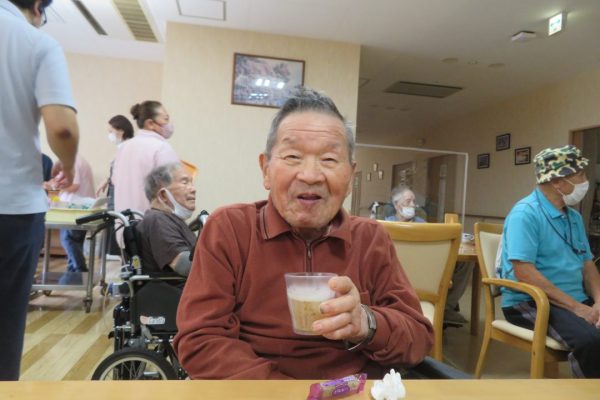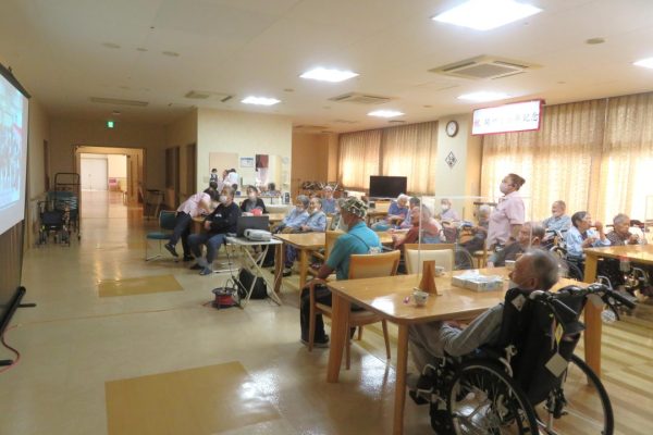 入所者の皆様は懐かしい映像を見ながら「あれ〇〇さんで?」「△△さん、写っとるでよ!」とコーヒーやノンアルコールのビールを飲みながら楽しそうに語り合っておられました。