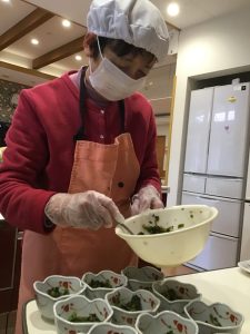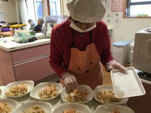 盛りつけていく入居者様。