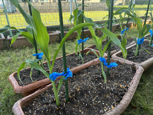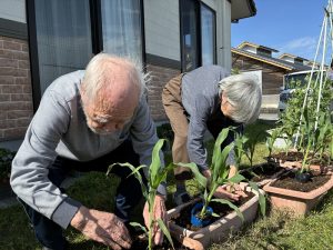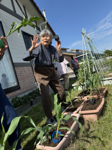 4月24日本日は雲一つない快晴!絶好のガーデニング日和となりました。 今回は施設の庭にあるプランターを使って、皆様と一緒にトウモロコシの苗植えに挑戦しました。