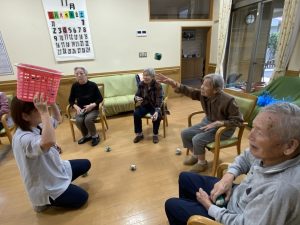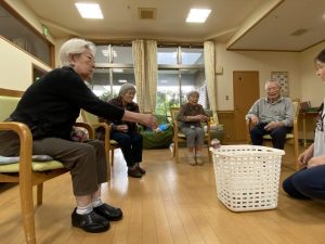 高い位置での玉入れでは、「顔に当たったら危ないわよー」