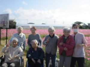 利用者の皆さんも「きれいねぇ」「こんなにたくさんのコスモスは初めてみたわ」と色とりどりのコスモスに皆さんからの笑顔がこぼれます。風に揺れる花を眺めながら、写真を撮り秋のひとときを満喫しました。