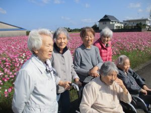 利用者の皆さんも「きれいねぇ」「こんなにたくさんのコスモスは初めてみたわ」と色とりどりのコスモスに皆さんからの笑顔がこぼれます。風に揺れる花を眺めながら、写真を撮り秋のひとときを満喫しました。