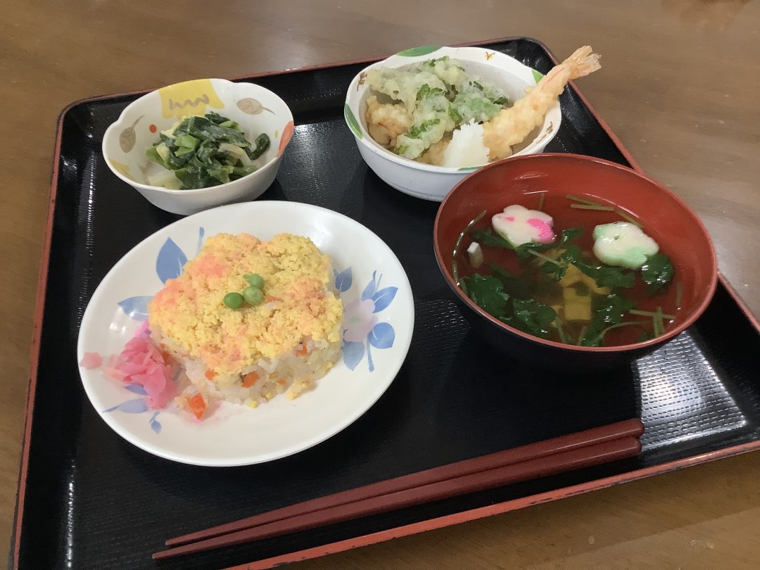 飾り寿司に天ぷら 、ぬた和え、花麩のお清汁をご用意しました。