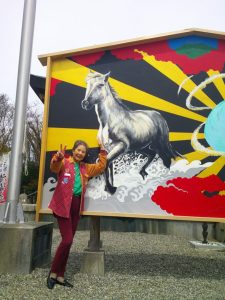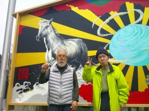 干支が描かれた大きな絵馬の前でポーズを決めて📷