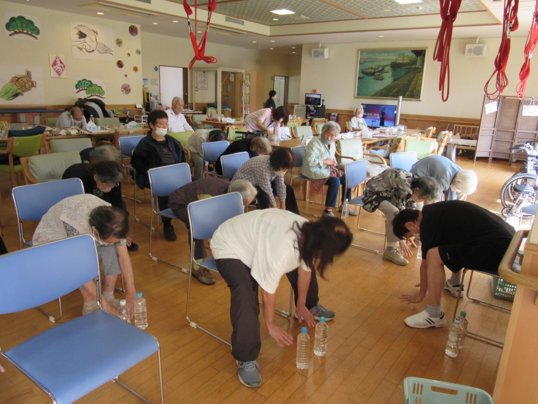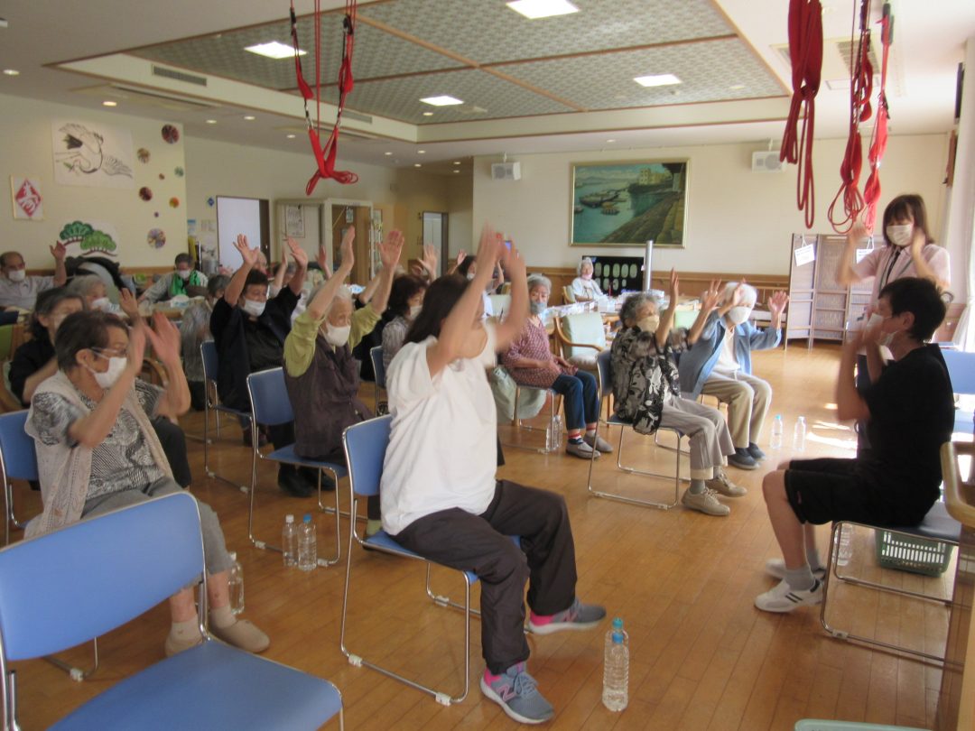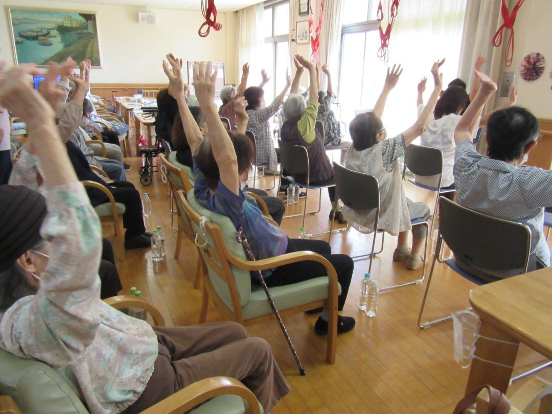 機能訓練指導員の掛け声に合わせて腕を上げ下げ、体を曲げたり