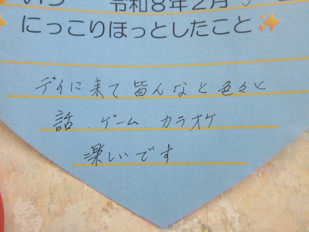 思わず「にっこり」したり、「ホッと」心が温まったりする瞬間、「嬉しい」「楽しい」を利用者様や職員で共有しましょう!という期間です(⌒∇⌒)🌟