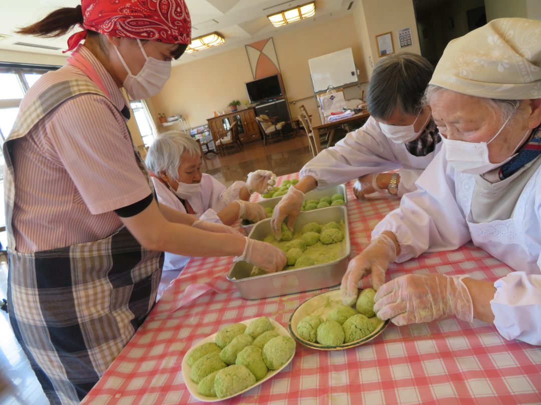 次に、適量のご飯を手に取り、優しく丸めていきます。初めての方も慣れた手つきの方も、それぞれのペースで丁寧に形を整え、仕上げは、鮮やかなうぐいす色や黄色い「きな粉」をたっぷりまぶして、はい完成!「思ったより簡単!」「きなこの香りがいいなぁ」と、(男性利用者T様談)。