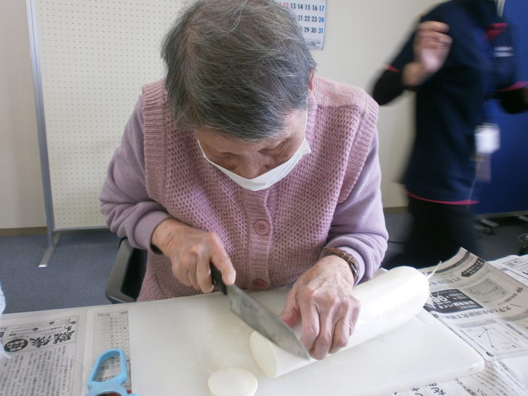 まさに、昔取った杵柄。周囲の皆さんと比べても、見劣りしない手つきでした。先日行った干し柿づくりのときにも感じたことですが、包丁を使う場面になると、「危ないのではないか」