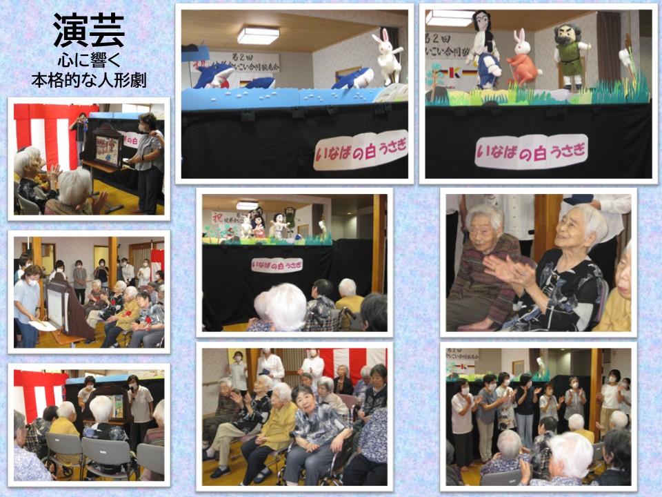演芸の時間には、人形劇「因幡の白兎」を披露。手作りの人形で繰り広げられる物語に「かわいいなぁ」と歓声があがり、皆様夢中でご覧になっていました。