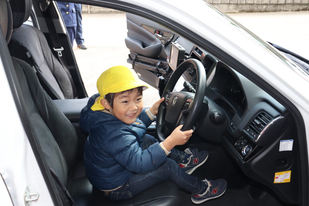 パトカーの赤いパトライトの光る様子を見せてもらったり、サイレンを聞かせてもらったりしました。「お-!!」と驚きの表情を見せる子どもたち。