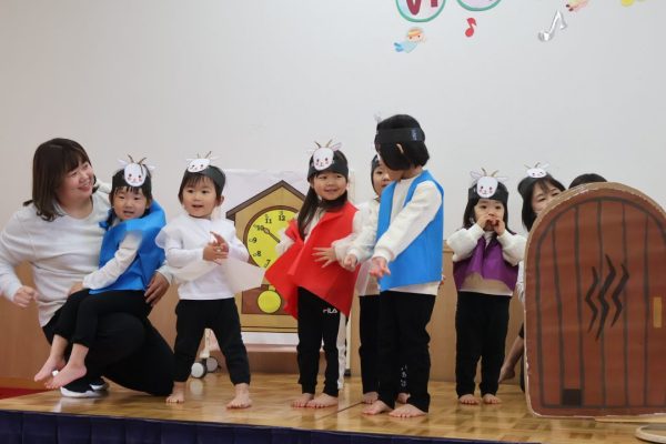2歳児は、「おおかみと七ひきのこやぎ」の劇ごっこ。お友だちとのやりとりの中で、大好きな絵本のフレーズを言って掛け合いを楽しむ姿が見られました。お母さんヤギ、子ヤギ、オオカミになりきった子どもたちは、のびのびとした表情で保育者や友だちと一緒に表現することを楽しんでいました。