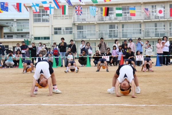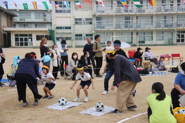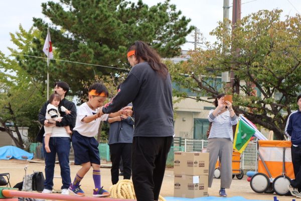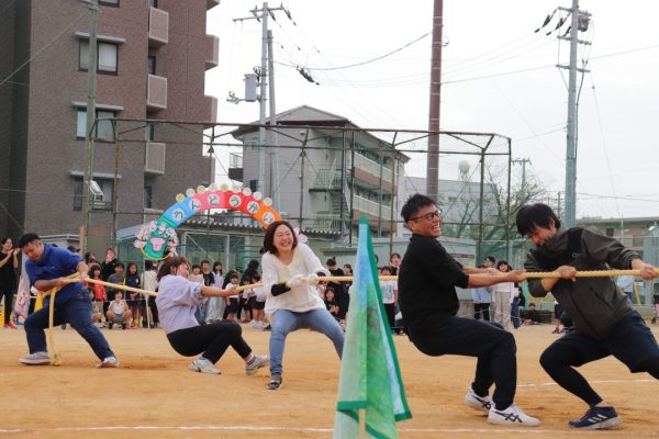 徒競走、親子競技は、異年齢チーム対抗となり、3歳児はうさぎ跳び、4歳児は平均台、5歳児はボール運びをし、箱から長さが違う紐を選んで、ゴールする競技。紐をバトン代わりに、次の人に繋げていき、速さと長さを競い合いました。保護者競技では、子どもたちもお父さん、お母さんが綱を引く姿を見て、園児席から大きな声援が。優勝チームには、ドリンクと入浴剤、横綱のお菓子をプレゼントしました。