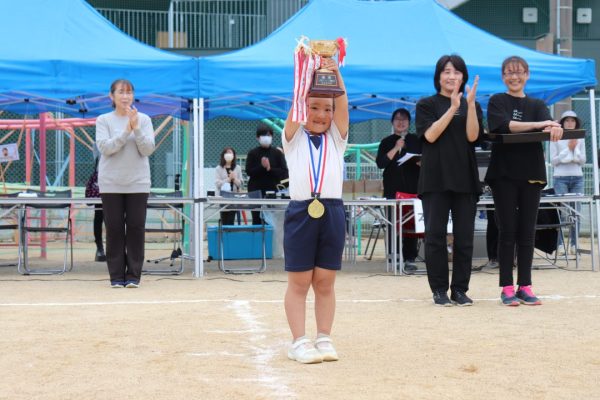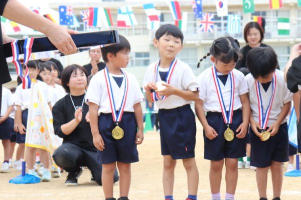 最後は、異年齢チーム対抗でリレー!4,5歳児がバトンを繋ぎ、ゴールを目指しました。チーム対抗では、優勝は「ほしチーム」、個人はかけっこで1位の子にメダルの授与をしました。天気に左右された一日となりましたが、育英認定こども園から曇り空を吹き飛ばすほどの子どもたちのパワーを感じた運動会となりました。また、来年も子どもたちの成長を楽しみに、育ちを支えていきたいと思います。