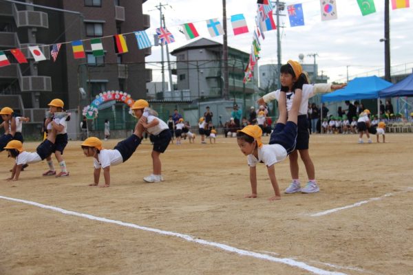 国旗、園旗の行進で始まり、異年齢チーム代表の6名が大きな声で宣誓!準備体操をし、元気に運動会が始まりました。プログラム2番は、5歳児による体操。3歳児から毎週1回体操教室をしてきた柔軟、組体操、剣道、鉄棒、跳び箱を披露しました。