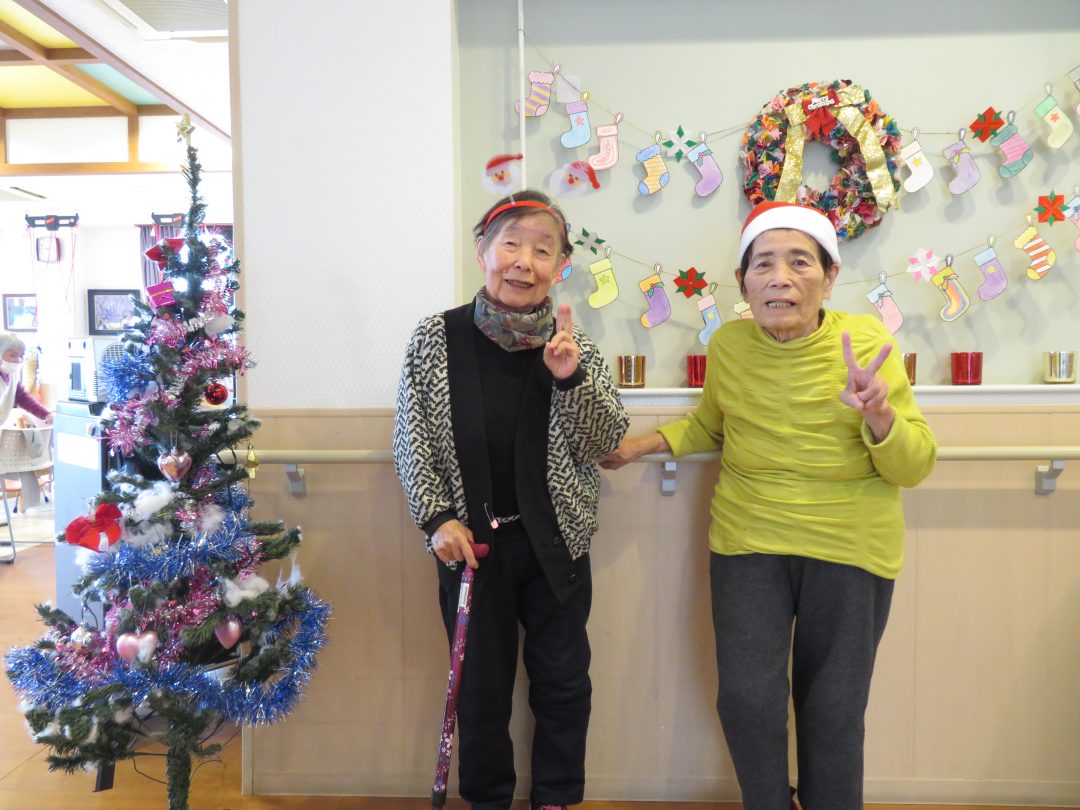 デイルームにはクリスマスツリーやリースを飾り、いつもとは少し違う、華やかで