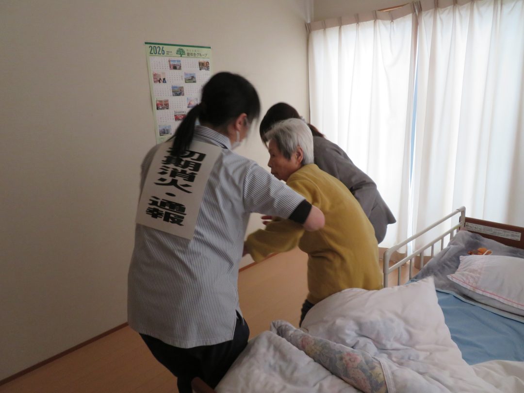地震・火災の発生を想定し、初期対応から避難誘導、安否確認までの流れを1つずつ確認しました。入居者様や利用者様には職員の声かけに耳を傾けながら、落ち着いて行動していただき、日頃の関わりや信頼関係の大切さを改めて感じる場面も多くみられました。