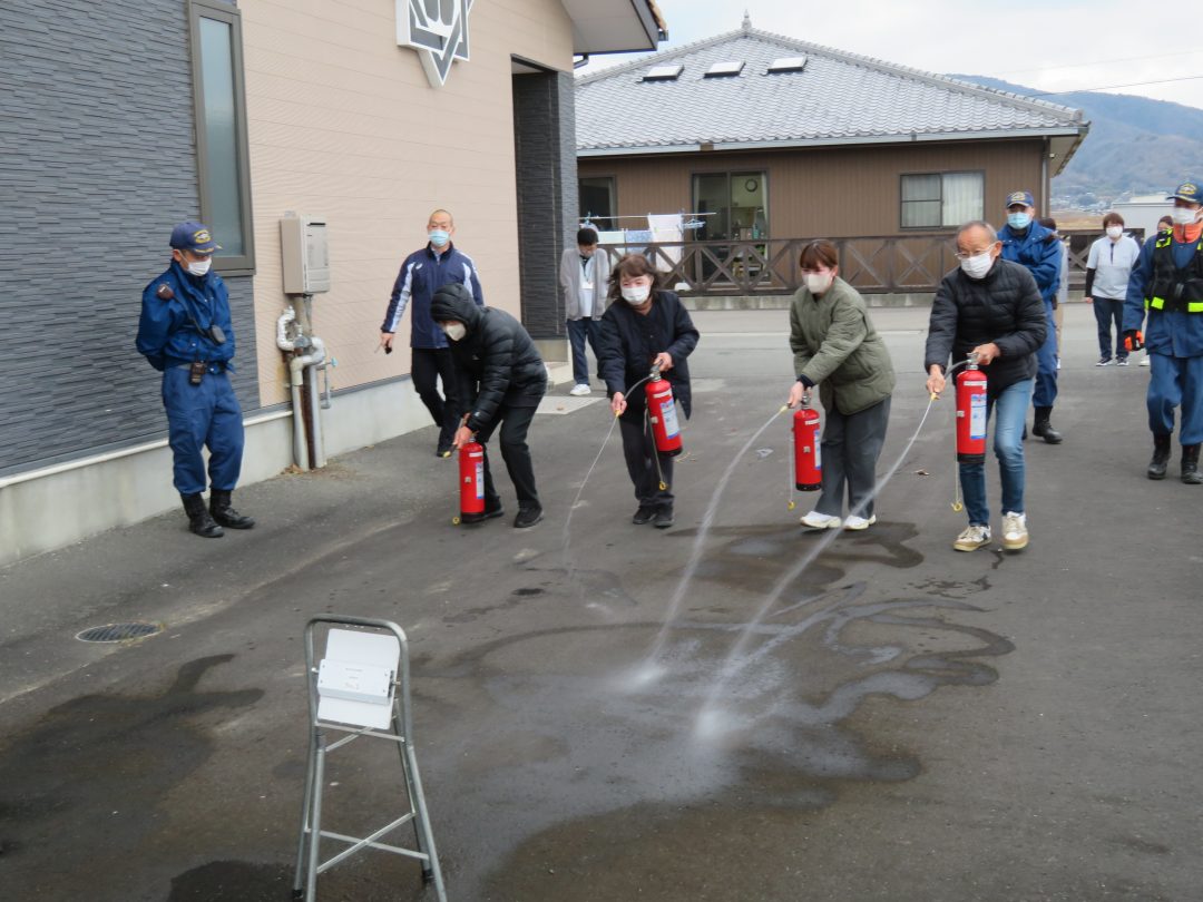 一連の防災避難訓練実施後に、消火器訓練も実施しました。職員が消火器を操作し、火元への向け方や噴射のタイミングなどを確認しました。実践的な訓練を通して、防災意識をさらに高めることができました。
