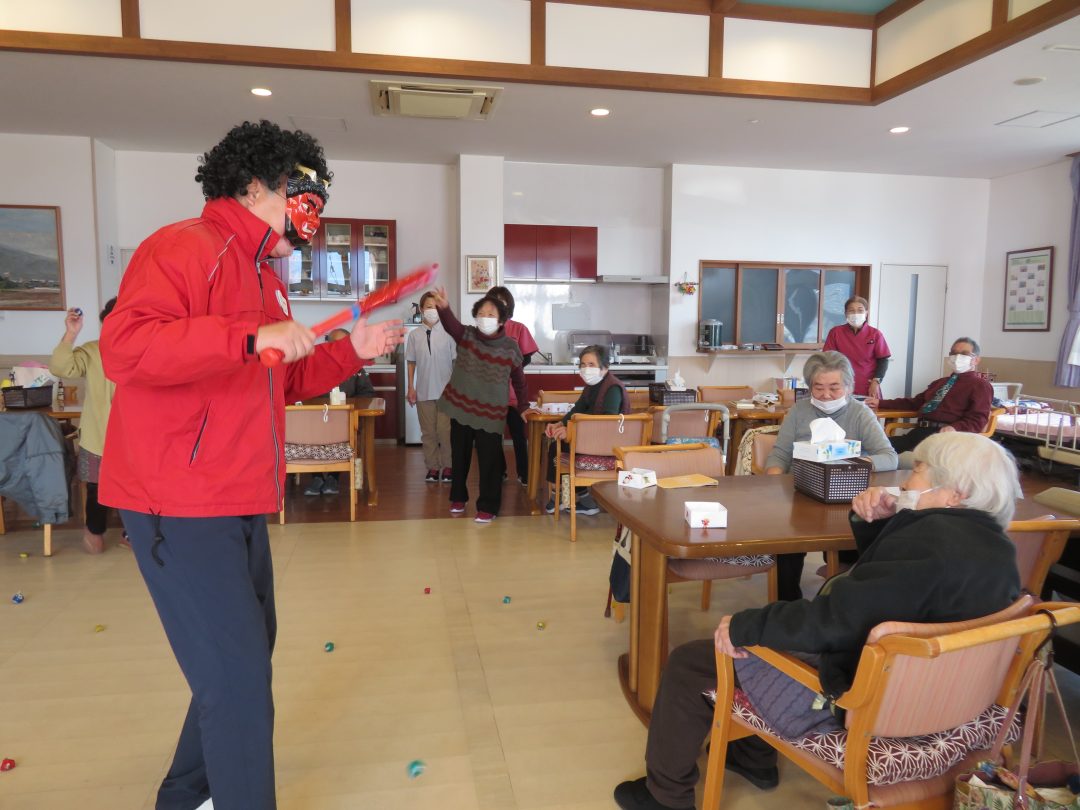 午後のおやつ前の時間、突如としてデイルームに威勢の良い声とともに、赤鬼と青鬼が乱入してきました! 中には、驚かれる方もいらっしゃいましたが、すぐに「鬼は外!福は内!」と元気な掛け声が上がりました。本物の豆の代わりに「特製!新聞紙を丸めたボール」を使用。もちろん、利用者様の手作りです♪皆様、日頃の運動の成果もあり、コントロールが抜群です!✨鬼に向かって「それっ!」と力強く投げ、見事に鬼を退散させることができました。