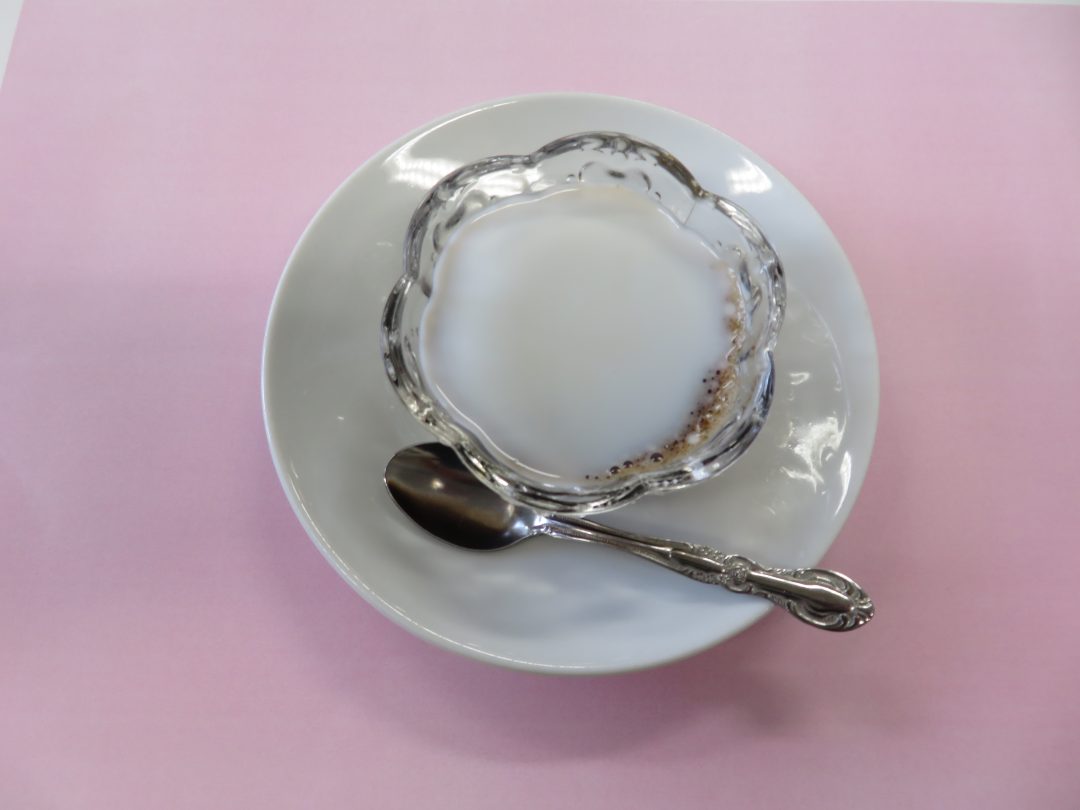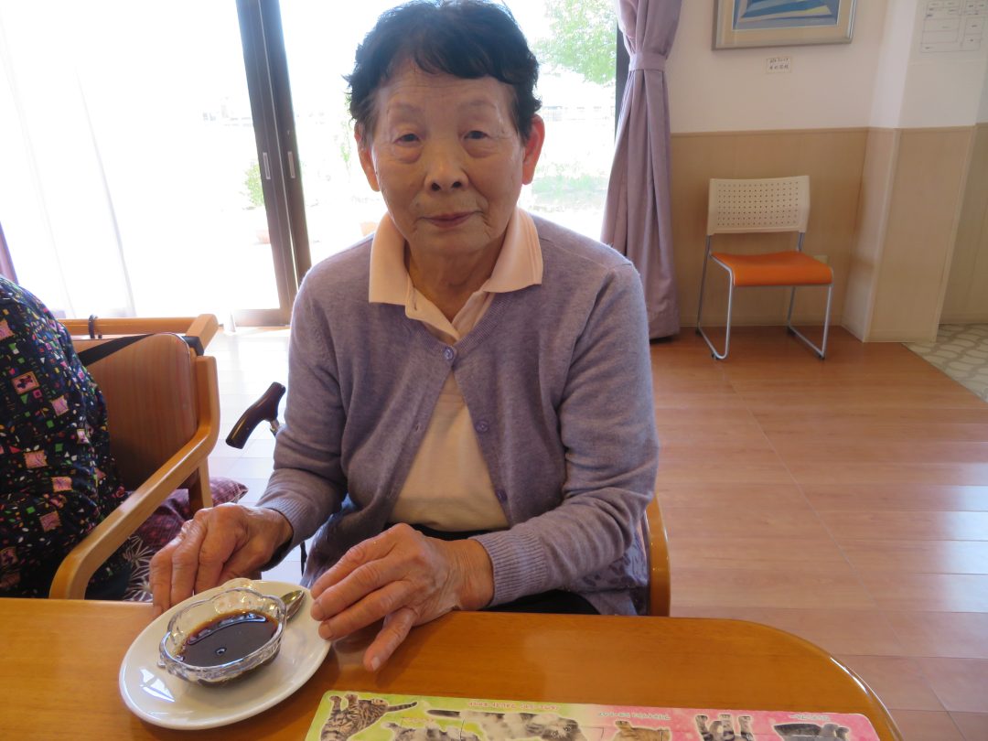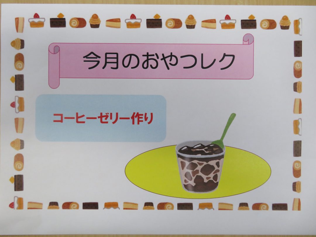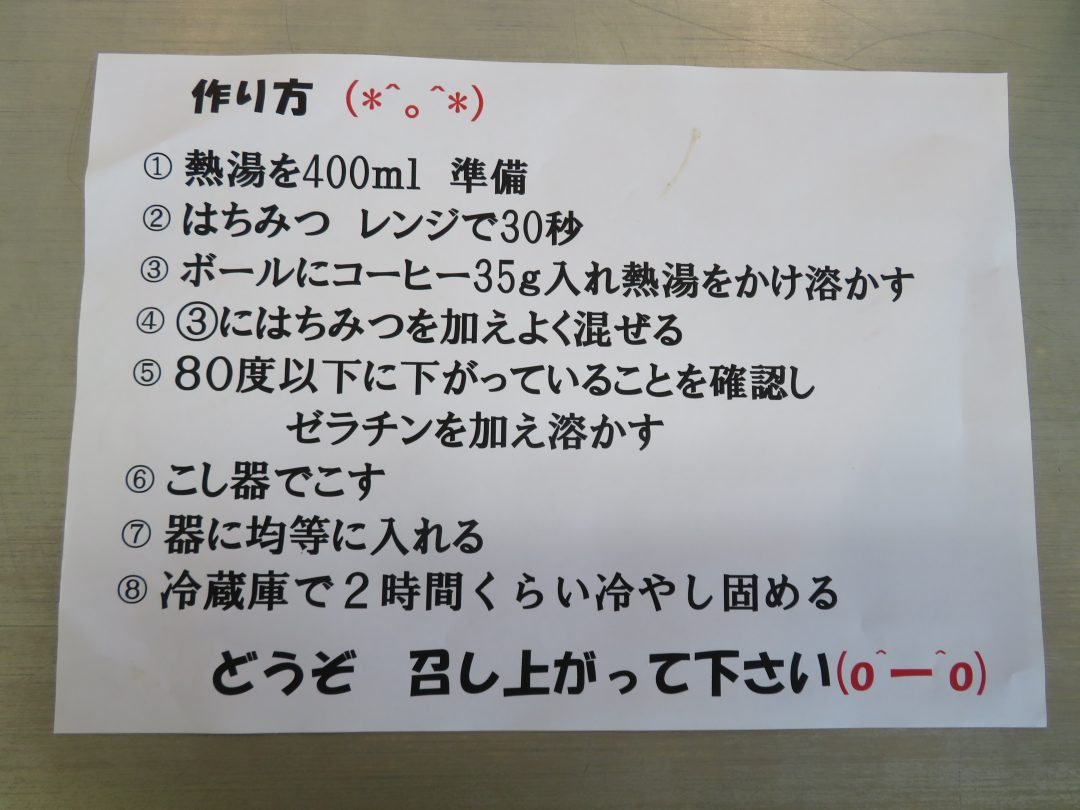 しっかりと固まったコーヒーゼリーには、フレッシュを添えて提供しました。つるんとした食感とほろ苦い味わいに、「甘すぎず食べやすいわ。」、「もう一つ食べたいなぁ。」といった嬉しい感想がたくさん聞かれ、大好評となりました。普段あまり食が進まない方も、笑顔で召し上がっている様子が見られたのが印象的でした。