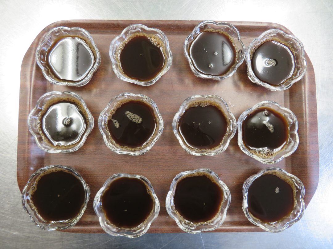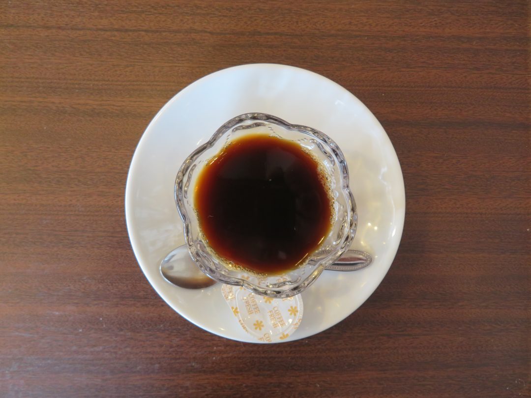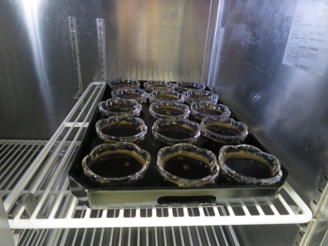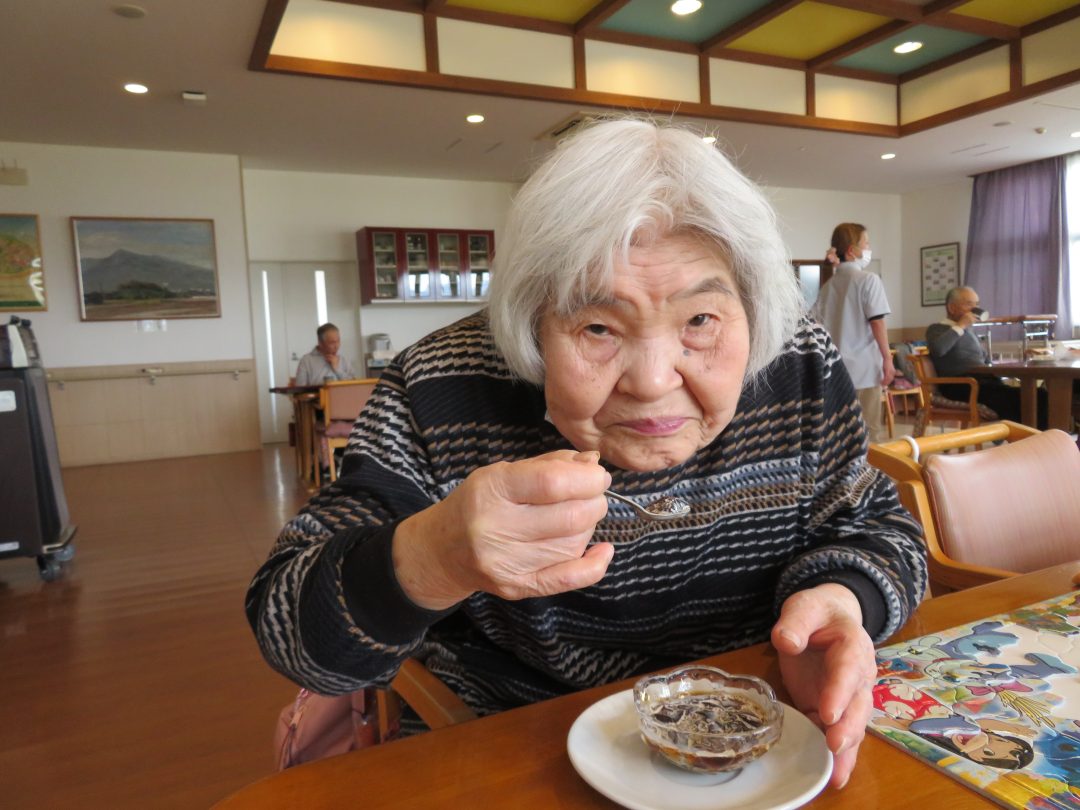 しっかりと固まったコーヒーゼリーには、フレッシュを添えて提供しました。つるんとした食感とほろ苦い味わいに、「甘すぎず食べやすいわ。」、「もう一つ食べたいなぁ。」といった嬉しい感想がたくさん聞かれ、大好評となりました。普段あまり食が進まない方も、笑顔で召し上がっている様子が見られたのが印象的でした。
