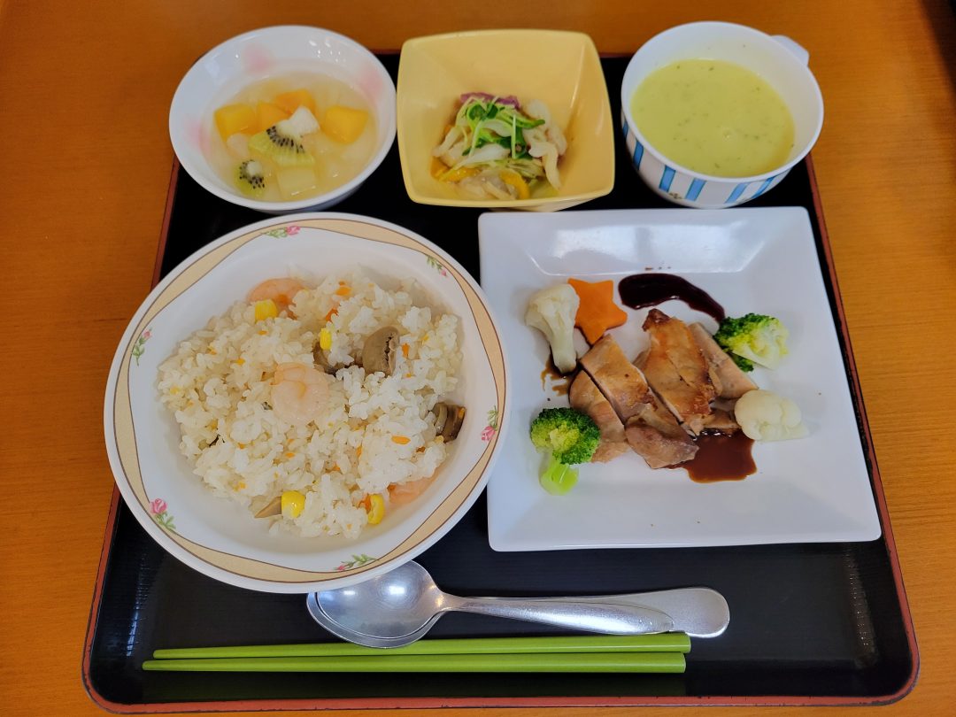 本日の昼食はローストチキンやエビピラフ🍴✨✨