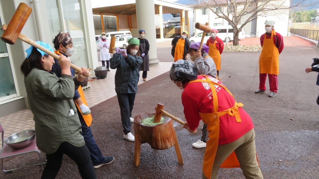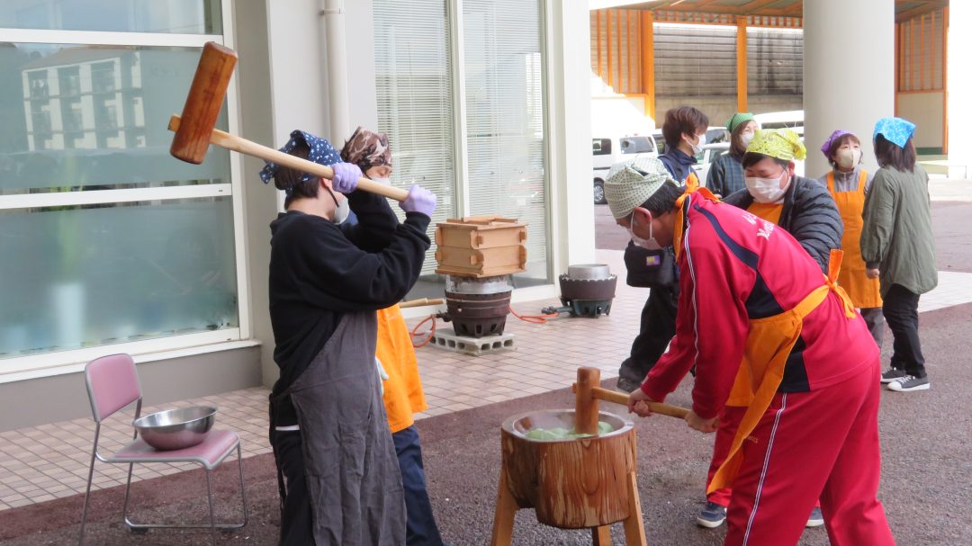 蒸しあがったら、杵と臼を使ってお餅をついていきます。💪