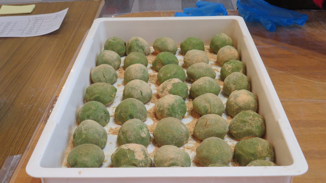 蒸しあがったお餅は一定の大きさに綺麗に丸めていきます。🙆
