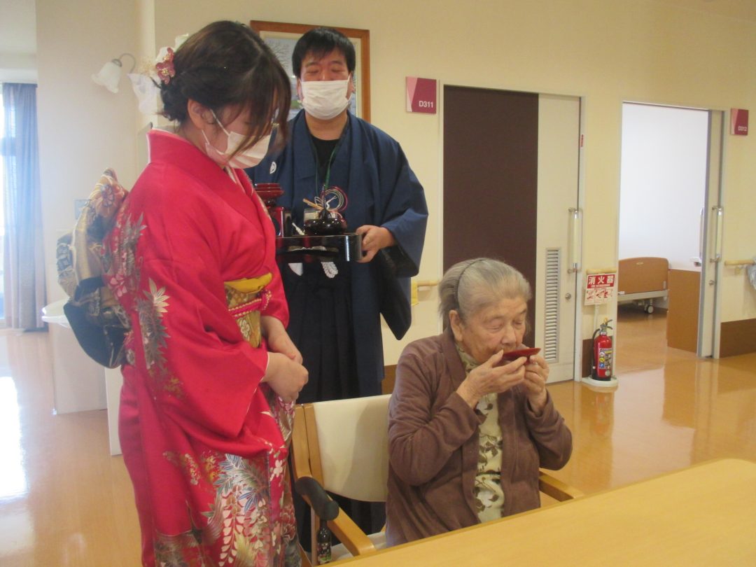 入居者様お一人お一人に 「今年も元気で過ごしましょうね」 「良い一年になりますように」 とお屠蘇をお配りしました。