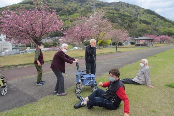 施設の前には大きな桜が満開となり「みんなで、はい!チーズ📸😊」
