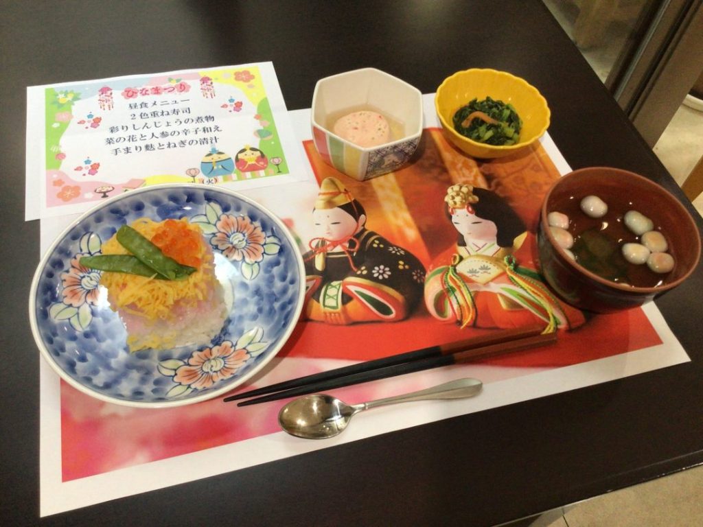 ひな祭りは2色の重ね寿司を提供しました。桜でんぶで染めています🌸