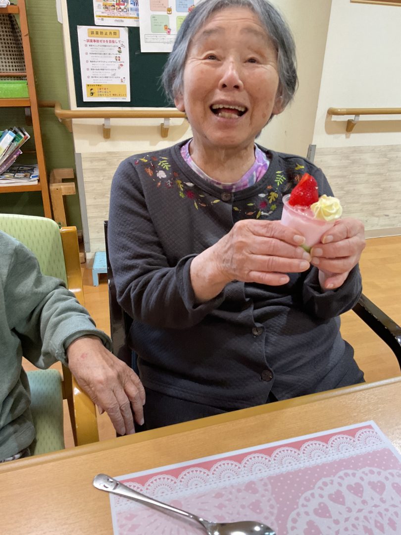 3Fの誕生日レクにて。施設のおやつ「抹茶蒸しパン」にアイスやフルーツ、ホイップにゆで小豆をトッピング。かなりのボリュームになりましたが、皆さんあっという間に完食されました。気温が高い日でしたので、ちょうどよかったです🍓😋