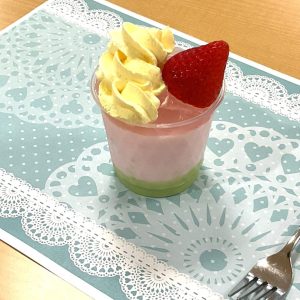 抹茶とイチゴのババロアは春らしい見た目で好評でした。角切りの桃ゼリーとカスタードホイップも綺麗な色で、味のバランスも非常に良かったです🍓😋