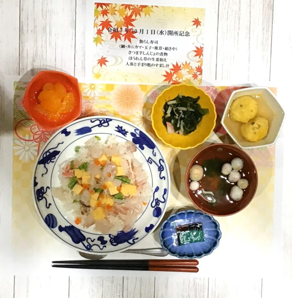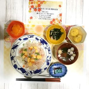 開所記念の食事です。彩の良いちらし寿司に、秋を感じる食材を取り入れました🍁